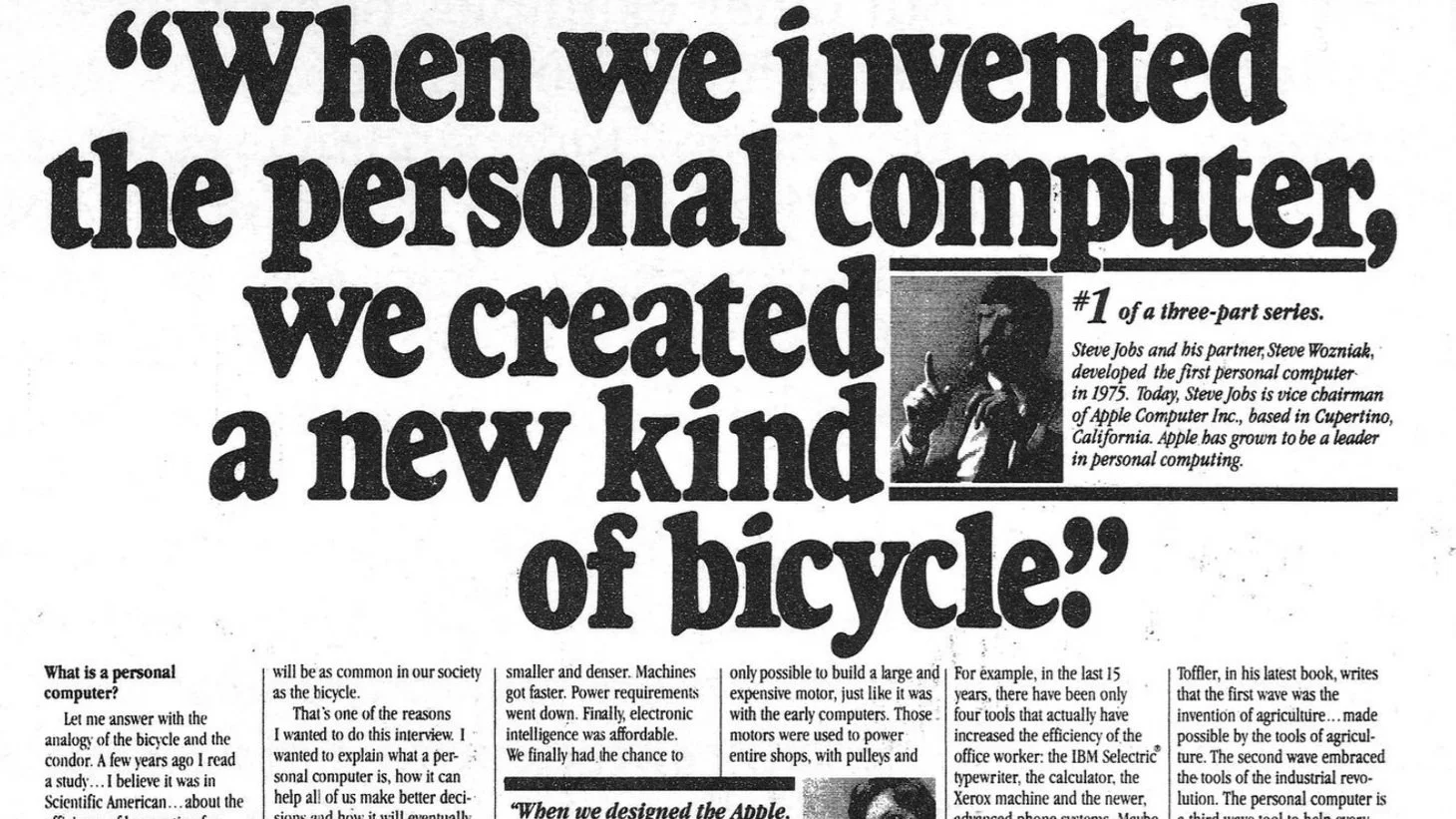 "I read a study that measured the efficiency of locomotion for various species on the planet. The condor used the least energy to move a kilometre. And humans came in with a rather unimpressive showing, about a third of the way down the list... But then someone at Scientific American had the insight to test the efficiency of locomotion for a man on a bicycle. And a man on a bicycle blew the condor away, completely off the top of the charts. And that's what a computer is to me. What a computer is to me is—it’s the most remarkable tool that we’ve ever come up with, and it’s the equivalent of a bicycle for our minds."